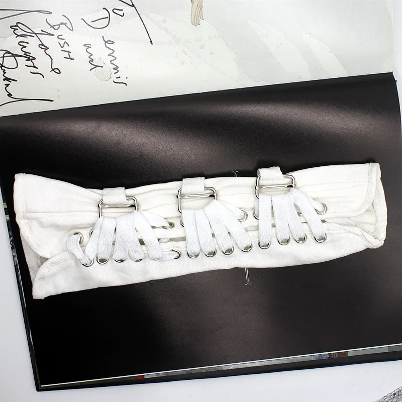Durable white canvas glove with soft flannel lining and elastic fly. Self adjusting three-cluster lacing attached to hook 'n pile straps simplifies application and ensures a proper fit from palm to forearm.